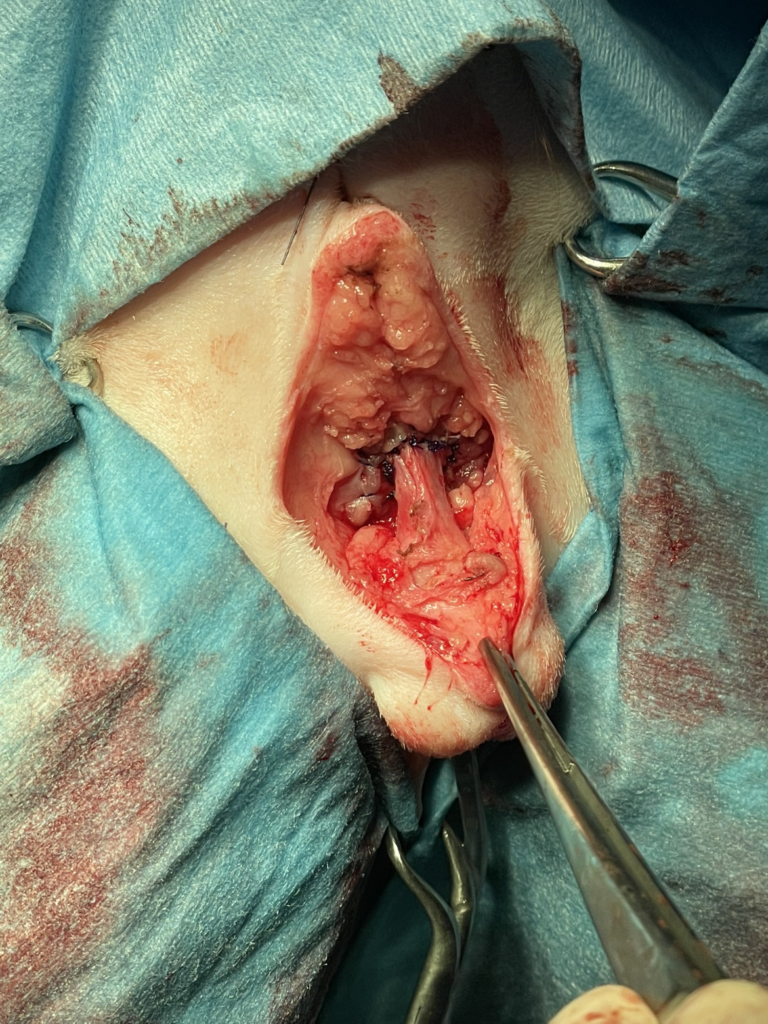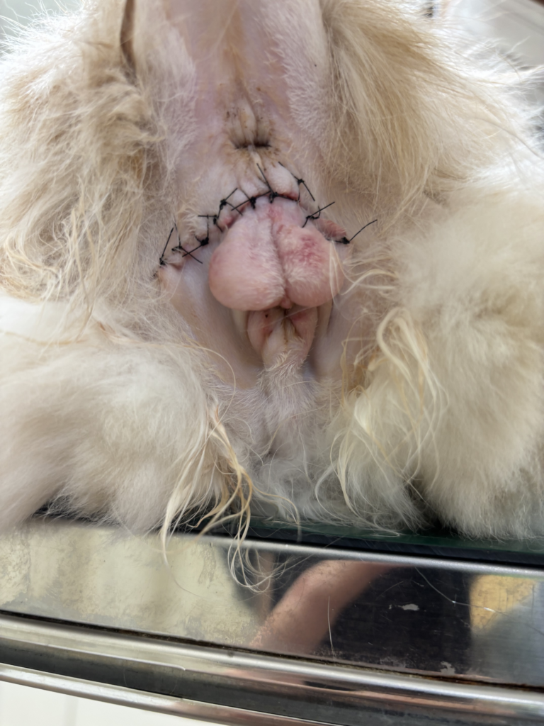 陰茎や包皮を切除し尿道粘膜を皮膚に縫い付ける手術です。外見状は女の子の猫ちゃんのようになります。ただし、皮膚の尿焼け、尿道開口部の狭窄のリスクや、包皮や陰嚢がなくなるため物理的な障壁がなくなり、肛門から細菌が入ってしまい細菌性膀胱炎のリスクが高まります。